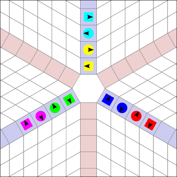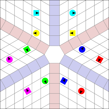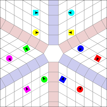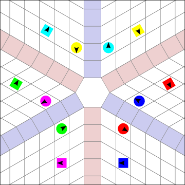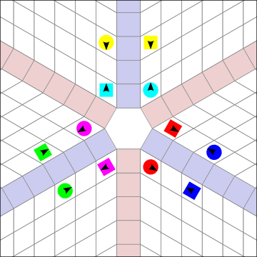 Girls adjust. Now we easily see the parallel Ocean Waves. When the Waves are formed like this, it is very natural to dance calls that operate between Waves, while there is only a moderate difficulty tradeoff dancing within the same Wave. Split Circulate is trivial, and All Eight (12!) Circulate is strangely easier in Hex than Square: see how easily the Girls would circulate in the center while the Boys circulate around the outside! The Waves are oriented towards, or along, the Heads positions, forming a "Y" shape. The branches of the "Y" are equal distances apart, 120 degrees.